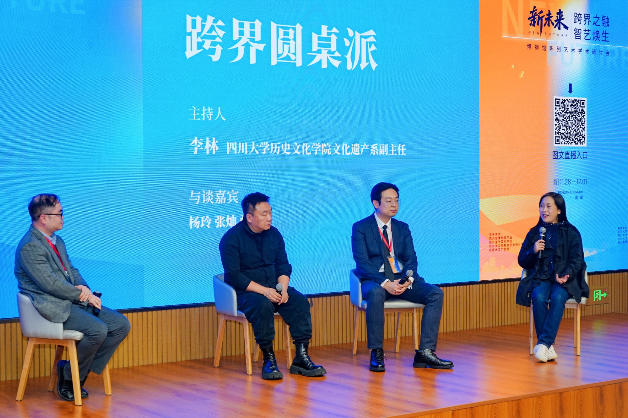 跨界圆桌派是本次研讨会的收官环节,由四川大学历史文化学院文化遗产系副主任李林主持,杨玲、张灿、张建三位来自不同领域的专家学者参与对谈。嘉宾们围绕会议主题,就博物馆展陈艺术的跨界融合、数字技术应用、空间叙事创新等议题展开深入交流,分享前沿观点与实践经验。