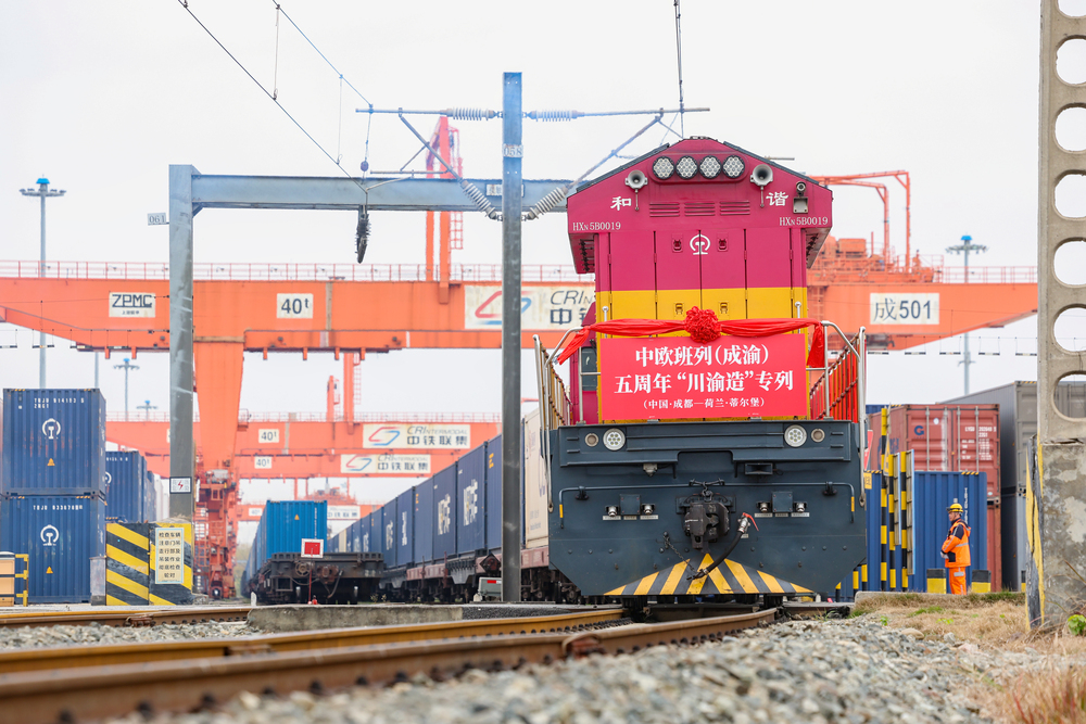 12月5日,两列满载医疗设备、车载显示器、邮包等货物的列车——中欧班列(成渝)五周年“川渝造”班列,同时从成都国际铁路港、重庆团结村中心站缓缓驶出,分别发往荷兰蒂尔堡和德国杜伊斯堡,以成渝联合之名奔赴新程。