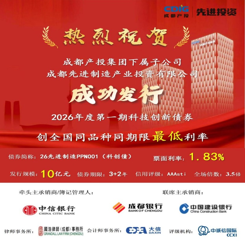 3月6日,成都先进制造产业投资有限公司2026年度第一期科技创新债券在银行间市场成功簿记发行,发行规模10亿元,期限3+2年,票面利率1.83%,全场认购倍数达3.5倍,边际认购倍数达1.79倍,创全国同品种同期限最低利率。