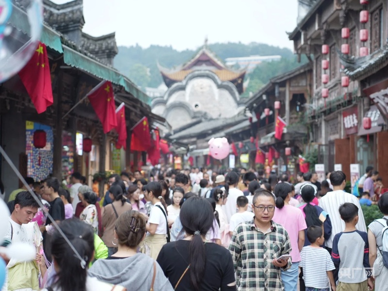 央广网成都10月4日消息(记者 昌思荣 王颖)国庆佳节,成都洛带古镇人山人海,伴随着《孔明开街》实景剧的锣鼓声,身着汉服的演员们演绎着三国典故,汉舞快闪与非遗表演轮番上演,融合古代赶场习俗与客家文化的开街仪式,点燃热闹喜庆的节日氛围。随后75米长的金龙震撼登场,赢得阵阵欢呼。五湖四海的游客汇集于此,用独特的方式“表白”祖国,整个古镇都充满着旺盛的消费活力与浓浓的家国情怀。