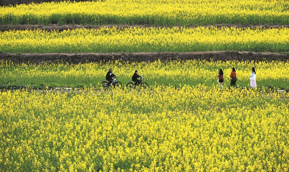 绕城绿道银杏大桥附近,大片油菜花正值盛放期,吸引众多市民前来骑行、拍照,尽享美好春光。