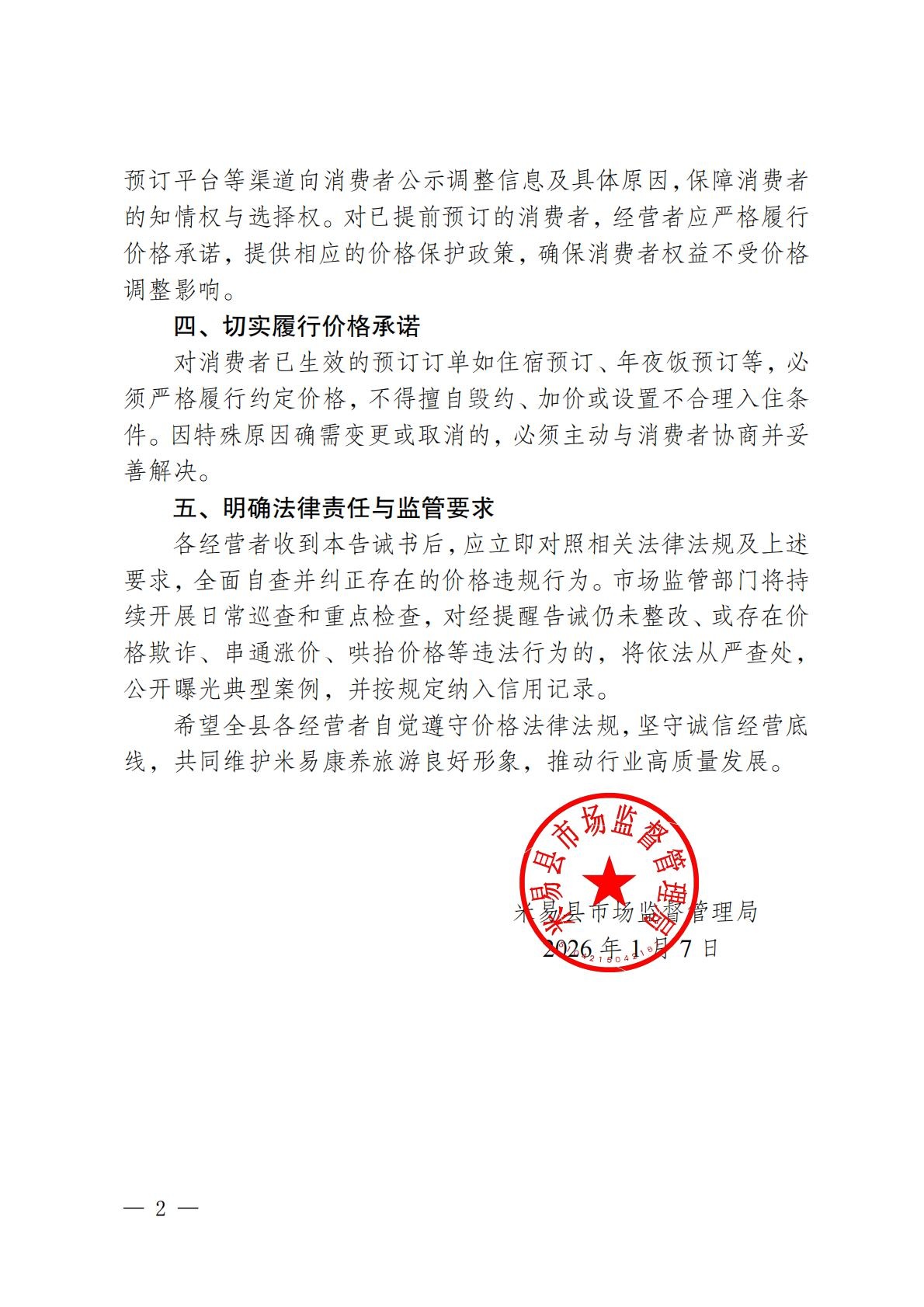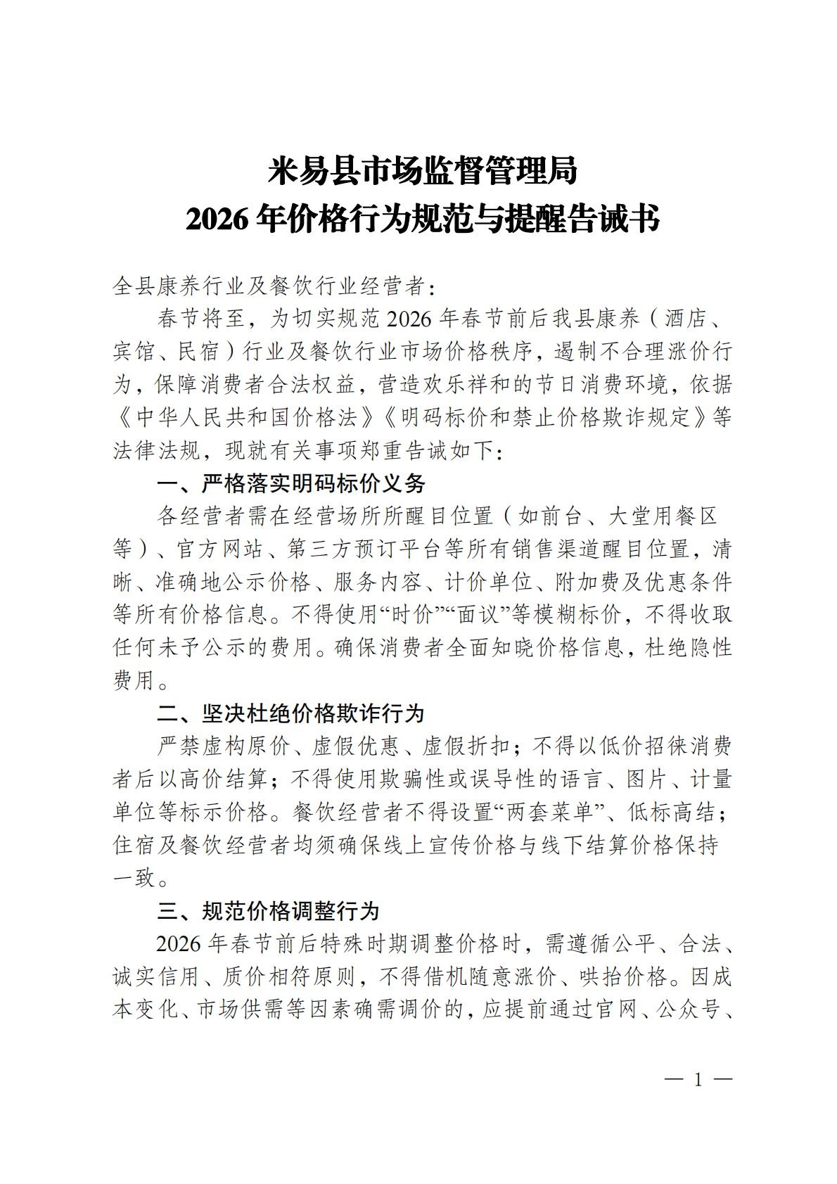 米易县2026年价格行为规范与提醒告诫书(央广网发 米易县市场监督管理局供图)
