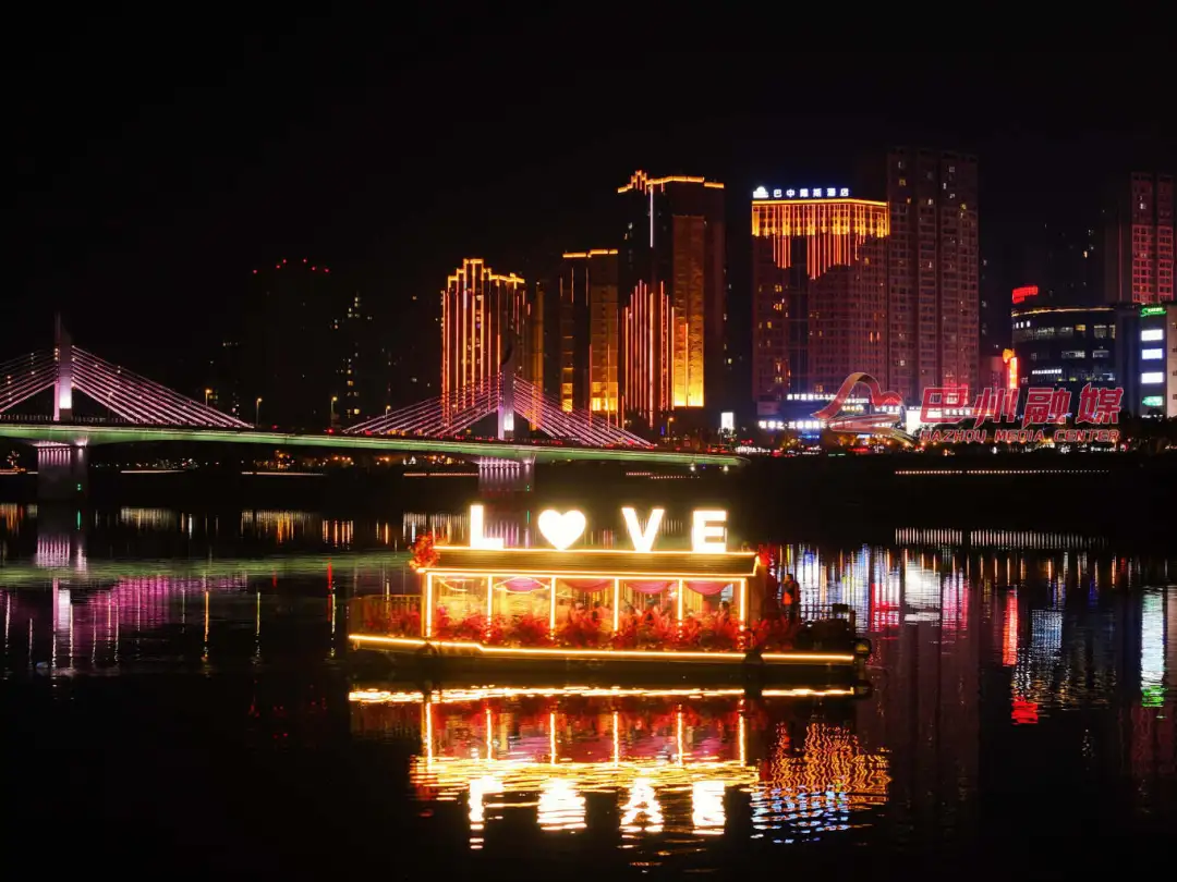 与此同时,静谧的巴河之上,六艘全新打造的主题画舫点亮彩灯、整装启航。画舫围绕“诗画巴山”“记忆码头”等独特文化IP与温情主题设计,配备专属NPC角色扮演互动,彻底打破传统夜游“静观”模式。游客乘船欣赏两岸流光溢彩、高楼林立的城市新夜景,沉浸式感受巴州的历史底蕴与发展新貌。乘船游客张玉玲深有感触:“坐在画舫上看巴城夜景,视角特别独特,两岸灯光璀璨、城市面貌焕然一新,能真切感受到巴州这些年的发展变化,既有老城记忆,又有新城风采,夜游体验非常棒。”