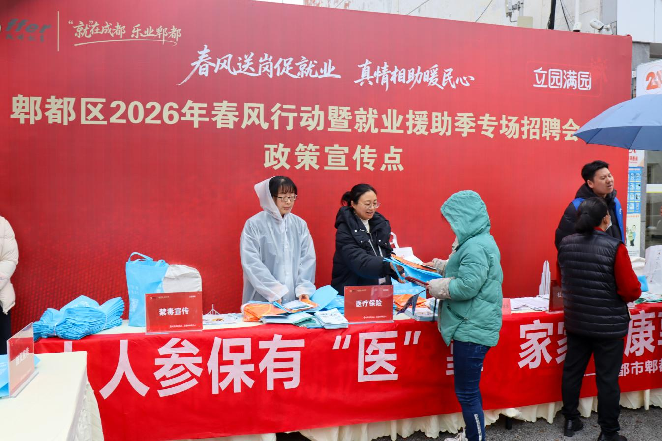 来自郫都区人社局、郫都高新区、区总工会、区退役军人事务局、区医保局、区妇联以及安德街道等单位的工作人员“摆摊设点”,为企业和求职者提供面对面政策咨询。从社保补贴、技能培训到劳动维权、重点群体就业扶持等,各类政策“一揽子”打包送到群众身边。