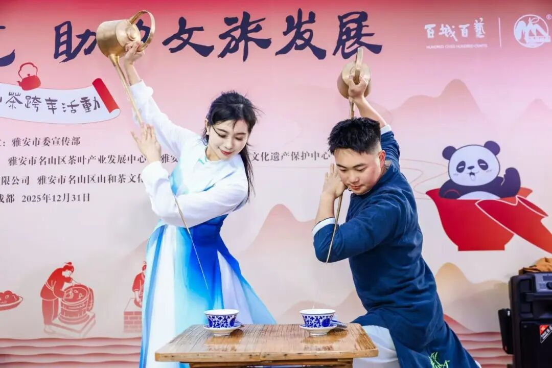 2025年12月31日晚,成都天府新区沉浸在“星河之约”跨年晚会的狂欢氛围之中,一场传统与现代交织、文化与激情碰撞的盛会,吸引着八方来客汇聚于此。而作为四川茶文化瑰宝的蒙顶山茶,以“传承非遗技艺 助力文旅发展”为主题惊艳登场,成为当晚璀璨星河下最具韵味的一抹亮色。
