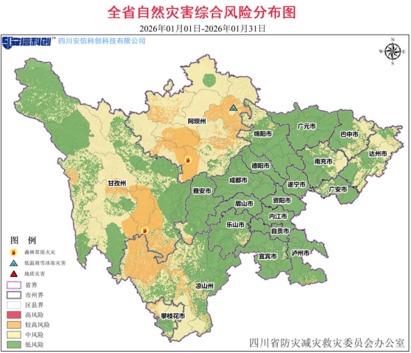 日前,四川省防灾减灾救灾委员会办公室印发《2026年元旦节及1月份全省自然灾害综合风险分析报告》。综合研判认为,元旦节及1月份应重点关注的自然灾害综合风险如下:攀西地区中部和西部、川西高原中部和南部主要致灾因子为森林草原火灾,其中阿坝州南部、甘孜州中南部、凉山州西部等地风险较高;川西高原东北部主要致灾因子为低温雨雪冰冻灾害,其中阿坝州东北部等地风险较高。