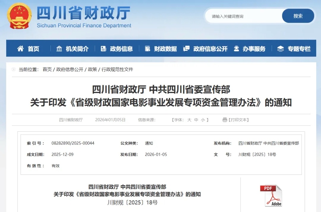 四川出台的新办法明确了省级电影专资的使用范围、分配下达、资金管理、绩效监督等方面内容,并在支持方向上进行了调整。新办法自2025年12月31日起施行,有效期5年。