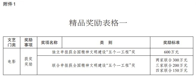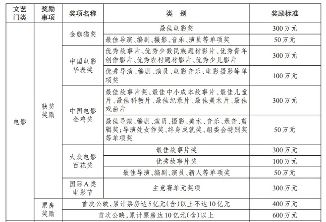 以下为《四川省重大文艺项目扶持和精品奖励办法》对电影的奖励标准: